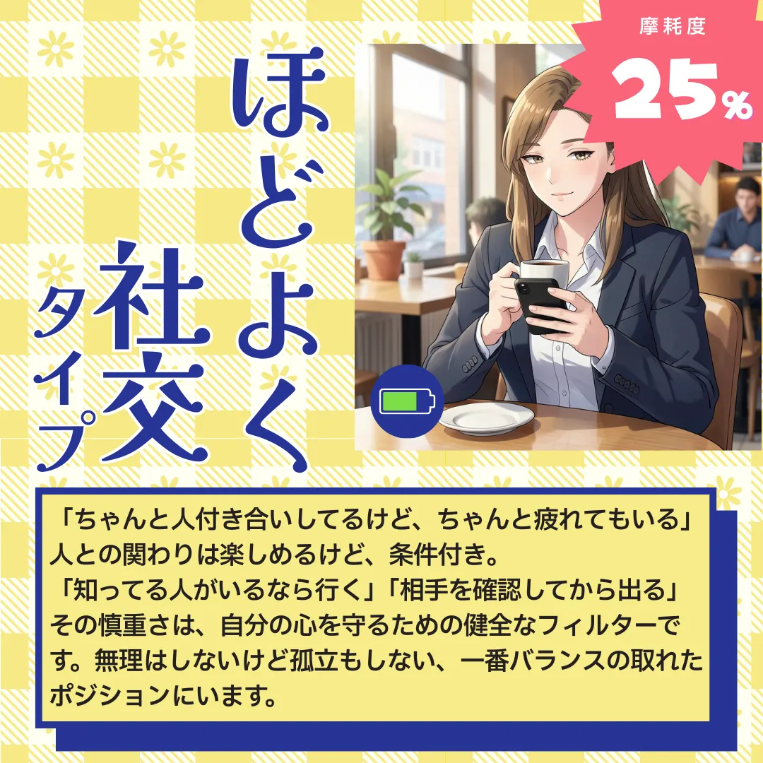 あなたは「ほどよく社交タイプ(摩耗度 25%)」です