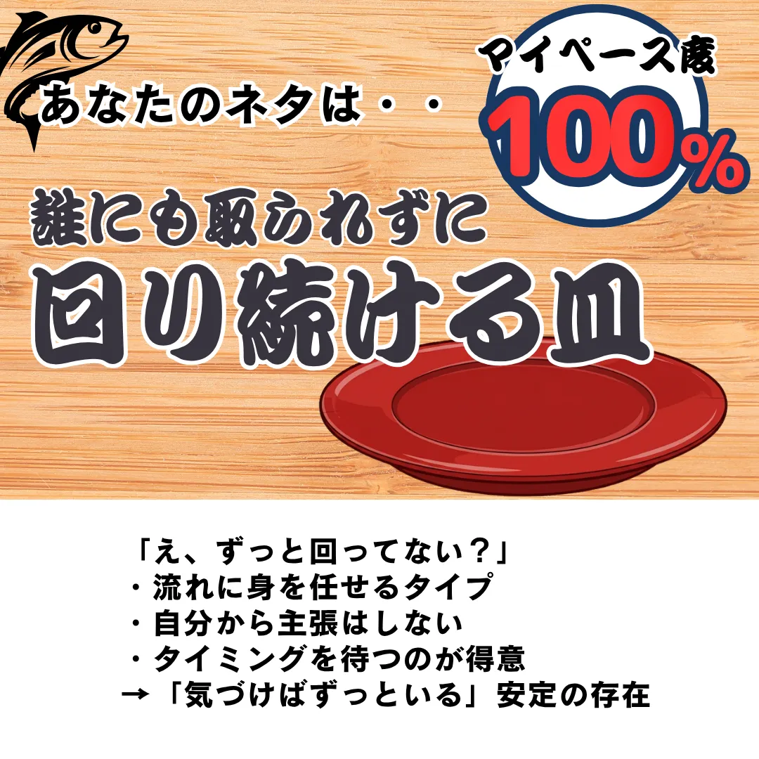 あなたは「誰にも取られずに回り続ける皿タイプ(マイペース度 100%)」です